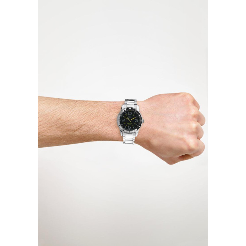 Браслет из нержавеющей стали. Корпус частично покрыт чёрным PVD-покрытием. Цвет циферблата — чёрный...