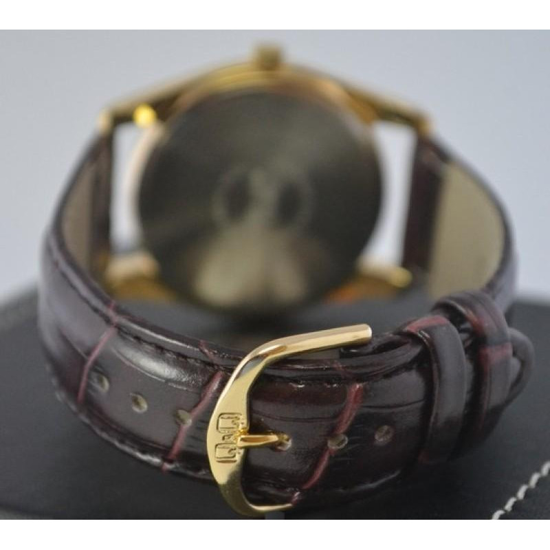 Модель имеет водонепроницаемость 30 м. Корпус выполнен из материала – латунь + PVD. Прочное минеральное стекло надежно защищает циферблат от ударов и других повреждений. Удобный кожаный ремешок позволяет часам комфортно сидеть на запястье. Из дополнительных функций имеются: секунды.
