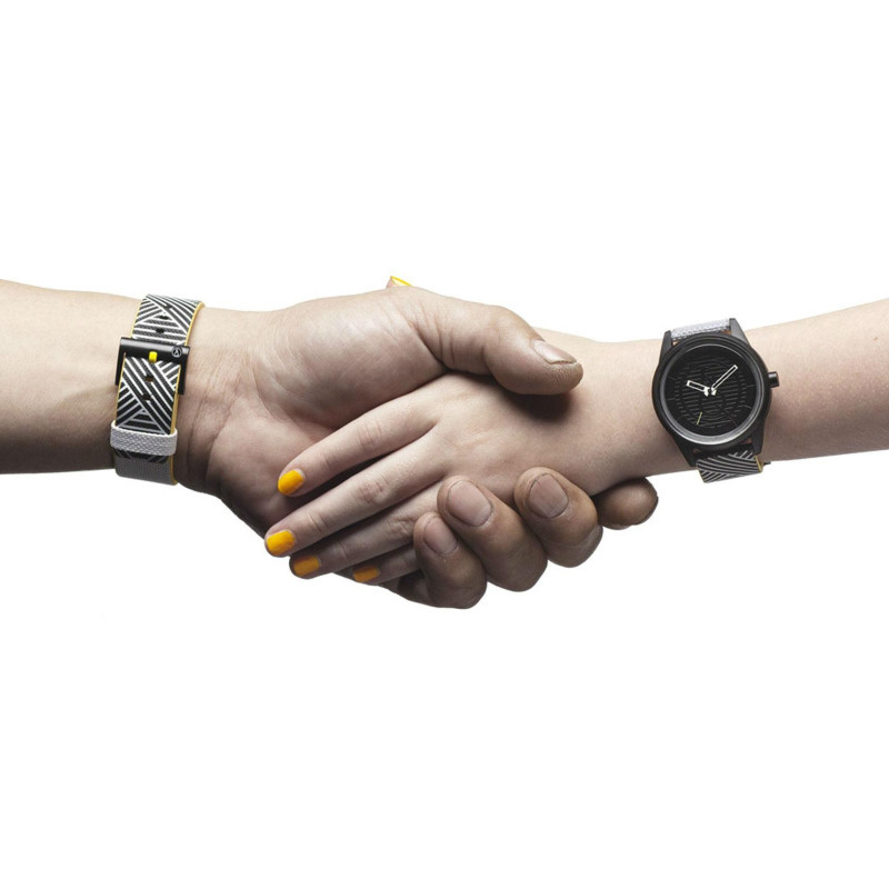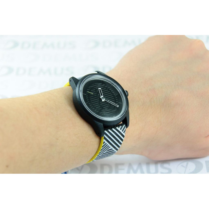 Корпус из пластика, чёрного цвета. Ремешок тканевый, чёрно-белого и жёлтого цвета. Циферблат — чёрно..