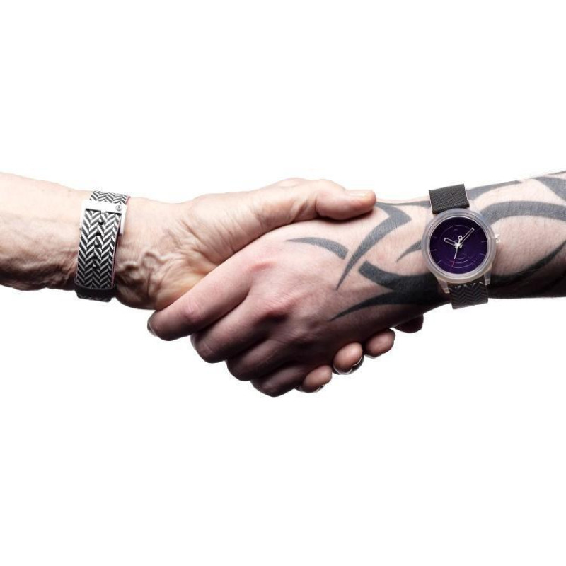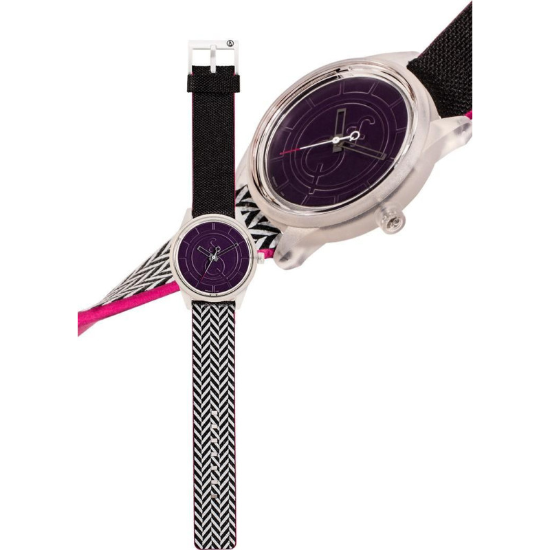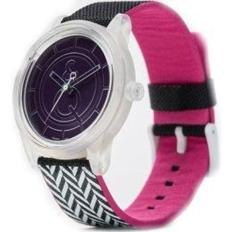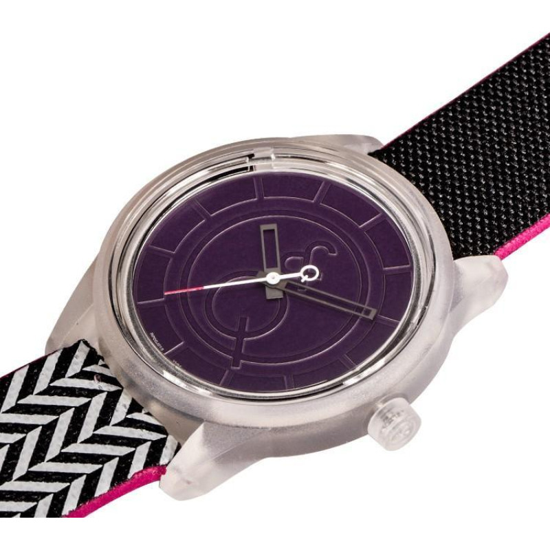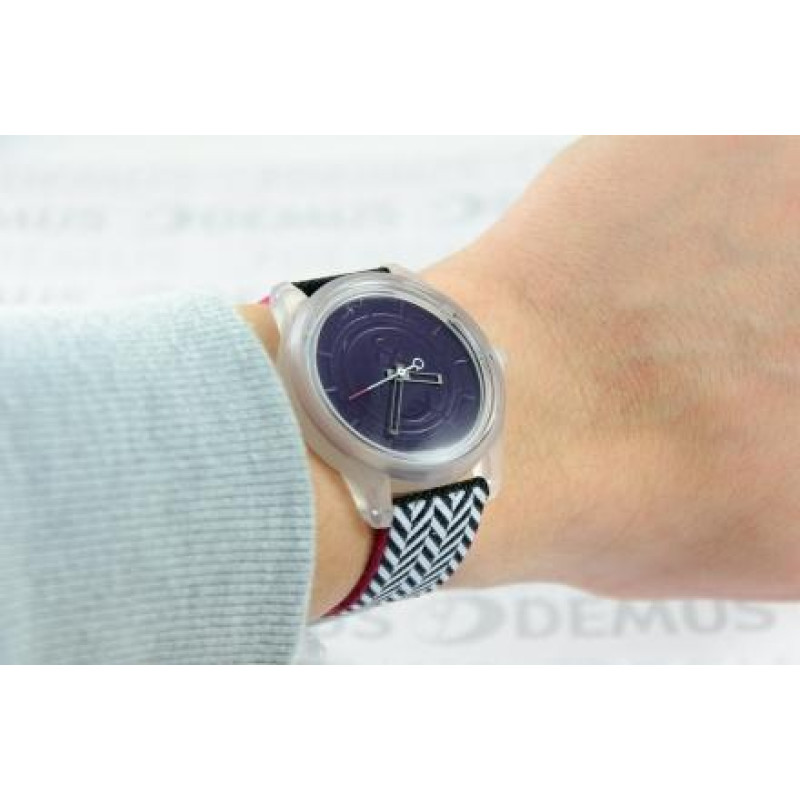 Корпус из прозрачного пластика. Ремешок тканевый, чёрно-белого и малинового цвета. Циферблат — тёмно..