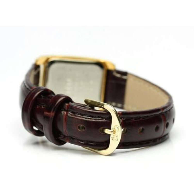 Корпус покрыт PVD-покрытием золотого цвета. Коричневый кожаный ремешок. Цвет циферблата — белый. Вид..