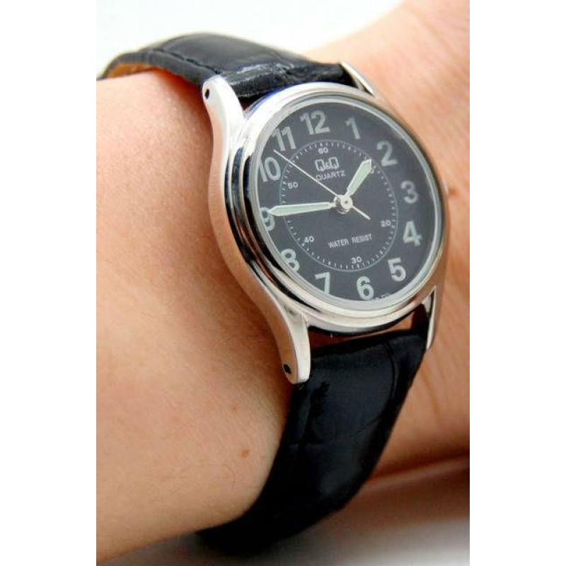 Стрелки с люминесцентным покрытием. Корпус серебристого цвета. Ремешок кожаный, чёрного цвета. Цифер..