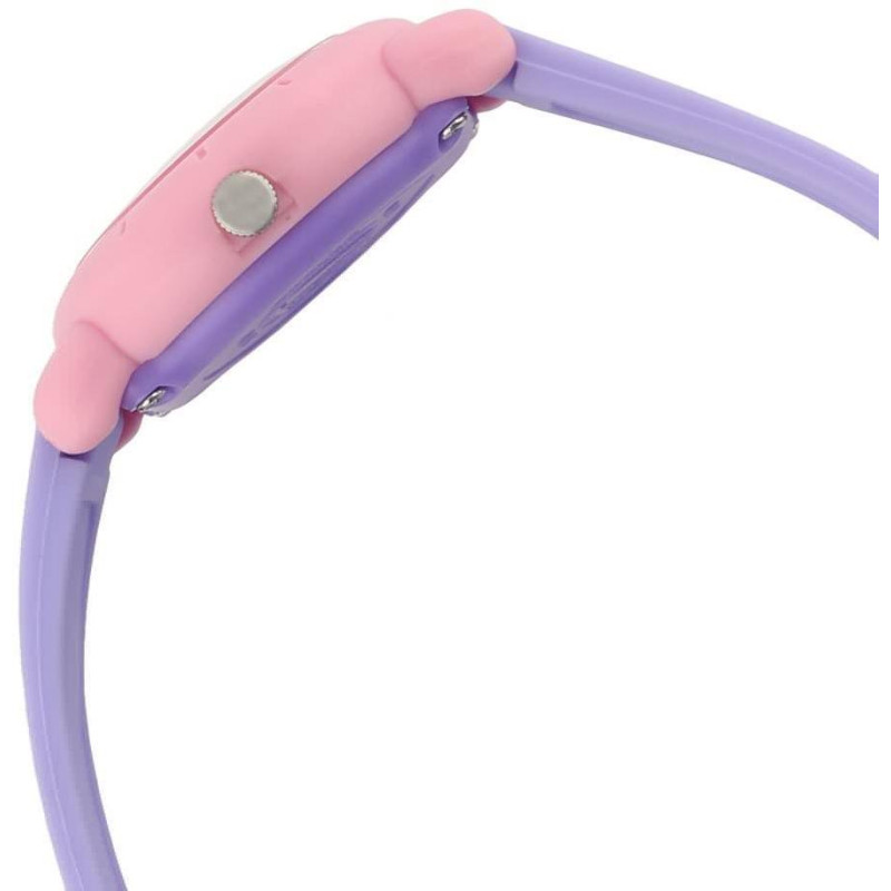 Фиолетовый полимерный ремешок. Розовый корпус. Цвет циферблата — бело-розовый. На циферблате изображ..