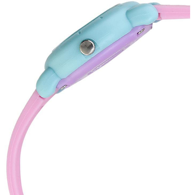 Розовый полимерный ремешок. Корпус голубого цвета. Циферблат — бело-голубого цвета, с изображением л..
