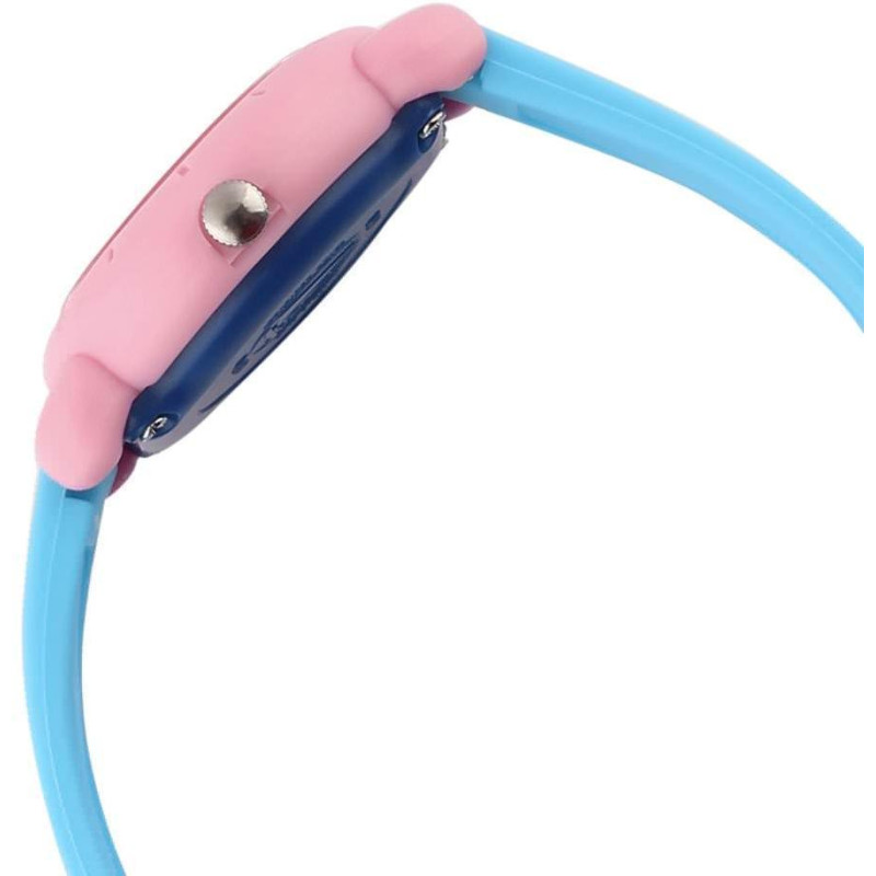 Голубой полимерный ремешок. Розовый корпус. Цвет циферблата — бело-голубой. На циферблате изображена..