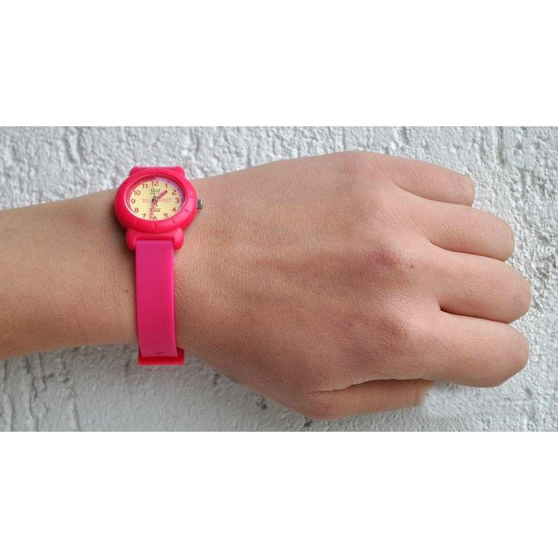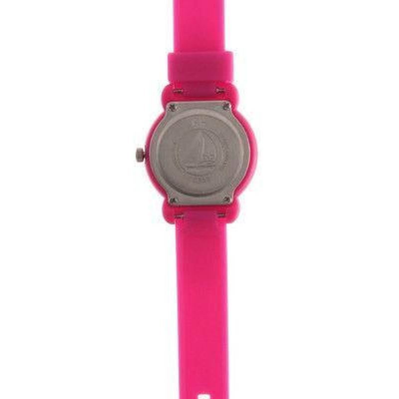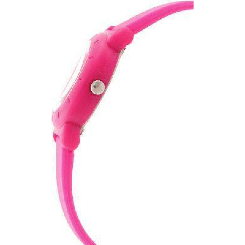 Розовый полимерный ремешок. Розовый корпус. Цвет циферблата — жёлто-розовый. Стрелки имеют обозначен..