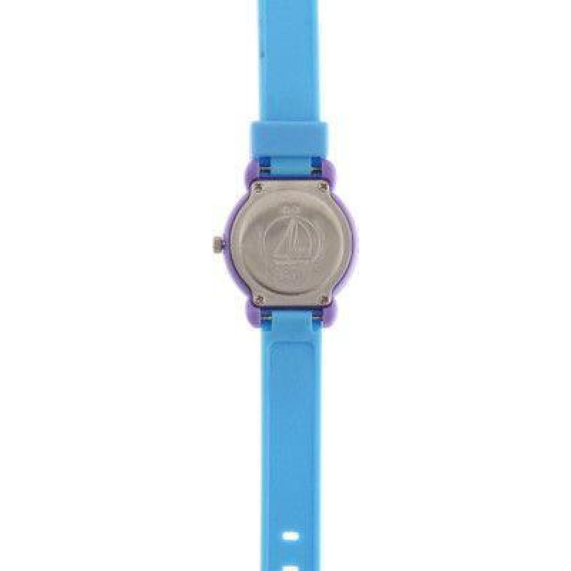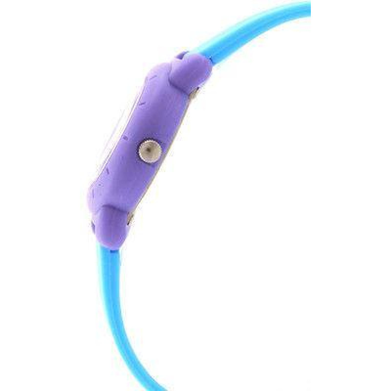 Голубой полимерный ремешок. Фиолетовый корпус. Цвет циферблата — белый. Стрелки имеют обозначения "h..