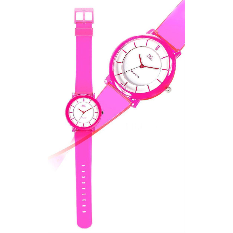 Розовый полимерный ремешок. Корпус розового цвета. Цвет циферблата — белый. Вид циферблата — индексы..