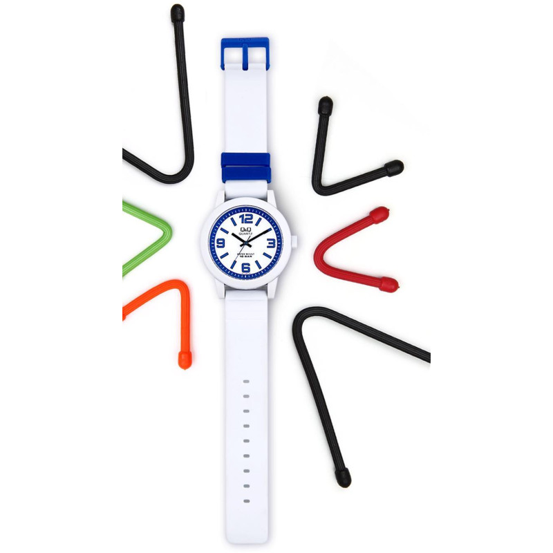 Белый полимерный ремешок. Корпус бело-синего цвета. Цвет циферблата — бело-синий. Вид циферблата — а..