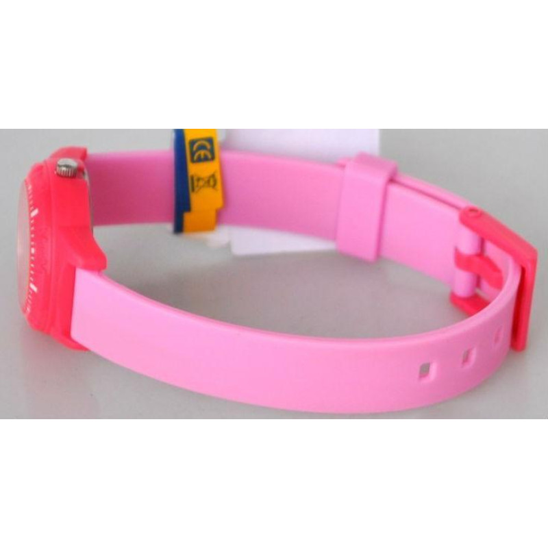 Розовый полимерный ремешок. Корпус красного цвета. Цвет циферблата — белый. Вид циферблата — арабски..