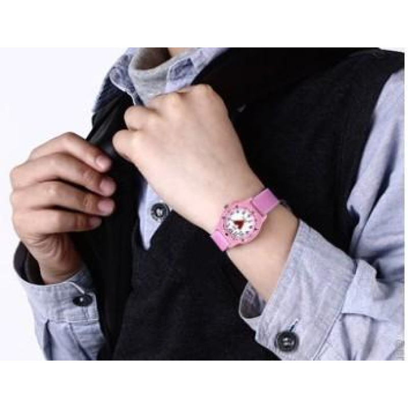 Розовый полимерный ремешок. Корпус розовый. Цвет циферблата - белый. Вид циферблата — арабские цифры..