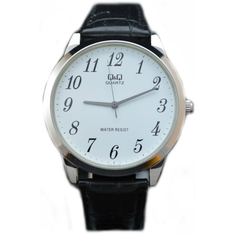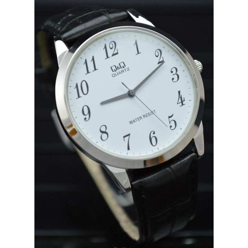 Корпус серебристого цвета. Чёрный кожаный ремешок. Цвет циферблата — белый. Вид циферблата — арабски..