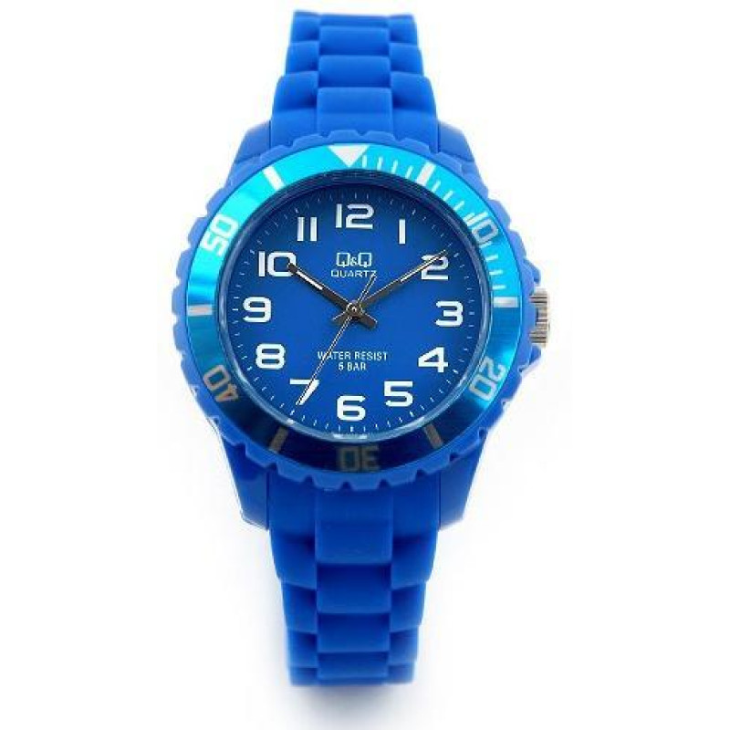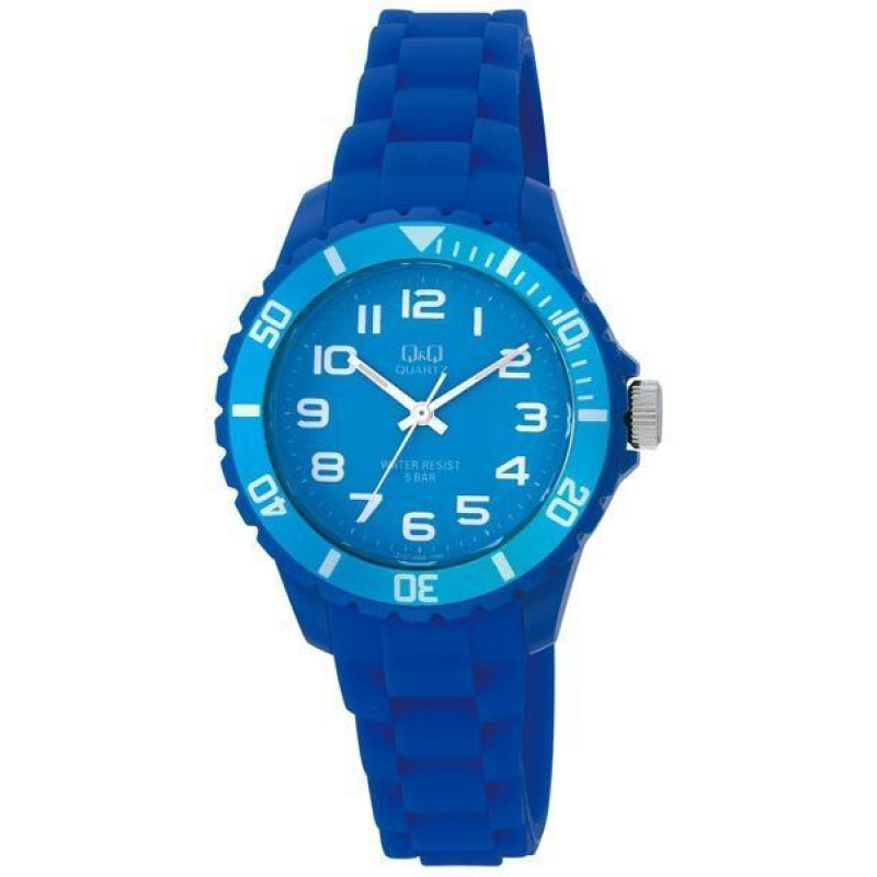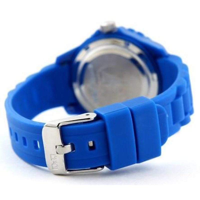 Синий силиконовый ремешок. Корпус сине-голубого цвета. Цвет циферблата — голубой. Вид циферблата — а..