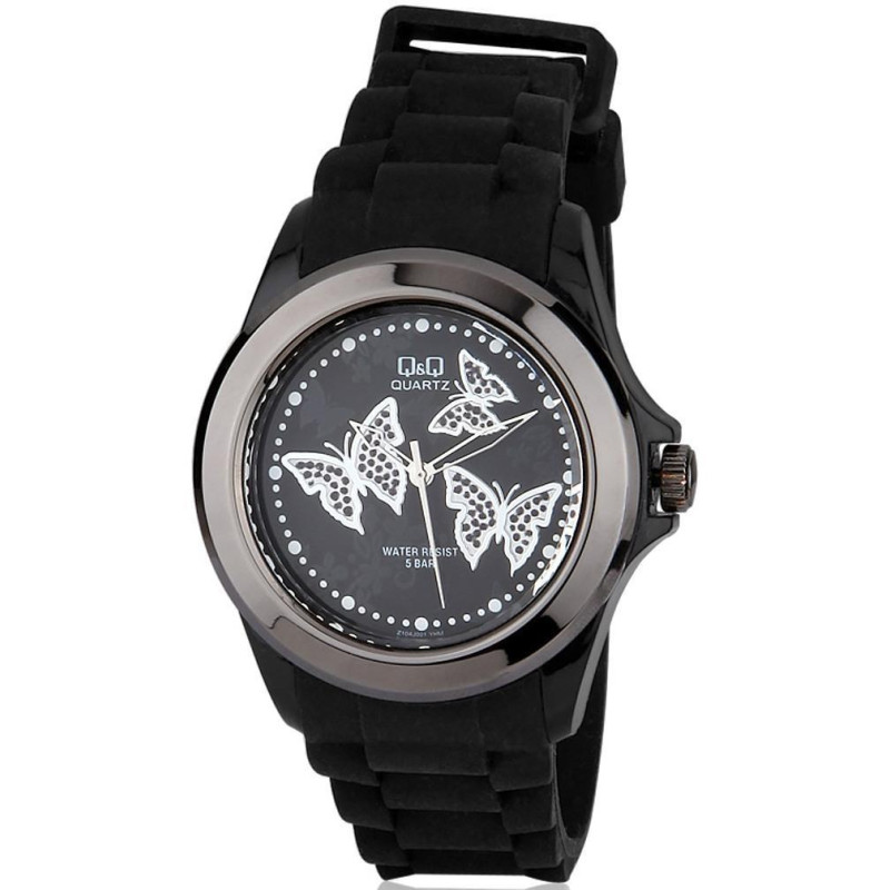 Чёрный силиконовый ремешок. Корпус чёрного цвета. Циферблат чёрного цвета и украшен блестящими бабоч..