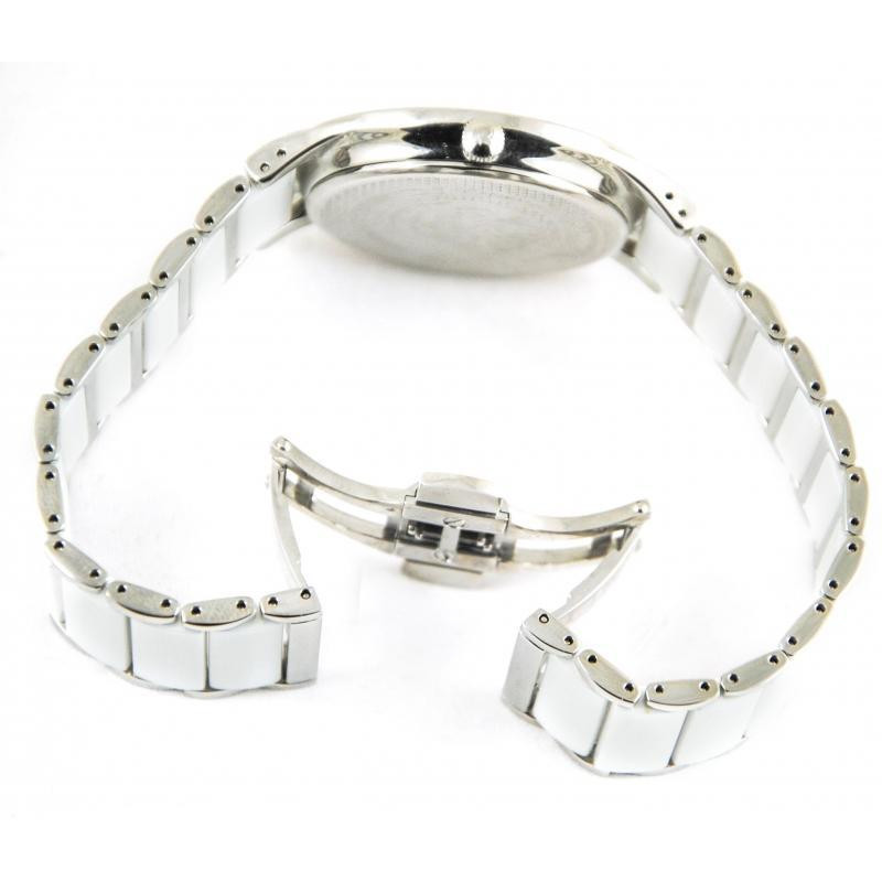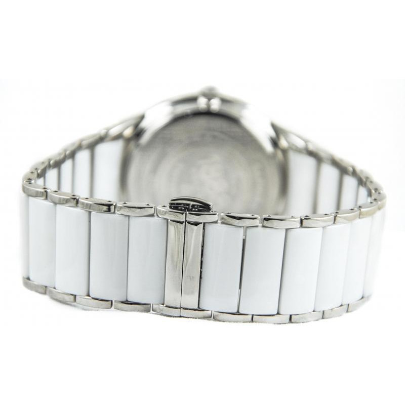 Модель имеет водонепроницаемость 30 м. Корпус выполнен из материала – комбинированный (сталь/керамика). Прочное сапфировое стекло надежно защищает циферблат от ударов и других повреждений. Удобный сталь + керамика браслет позволяет часам комфортно сидеть на запястье. Из дополнительных функций имеются: дата, минуты, секунды, часы.