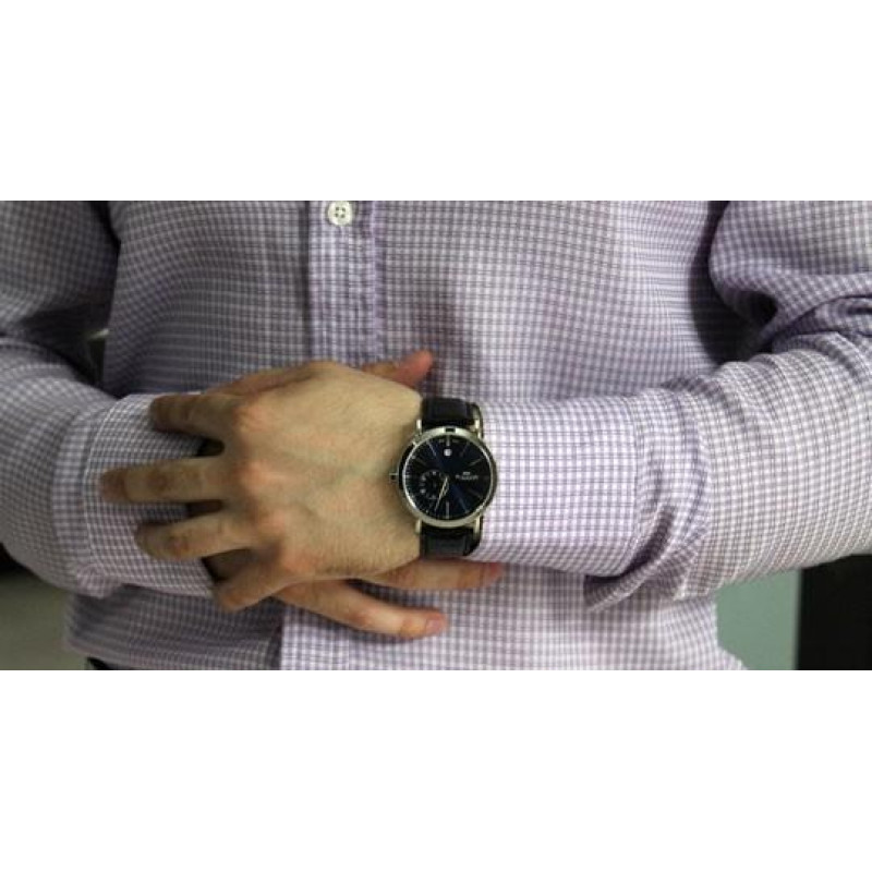 Модель имеет водонепроницаемость 50 м. Корпус выполнен из материала – сталь. Прочное сапфировое стекло надежно защищает циферблат от ударов и других повреждений. Удобный кожаный ремешок позволяет часам комфортно сидеть на запястье. Из дополнительных функций имеются: дата, минуты, секунды, часы.