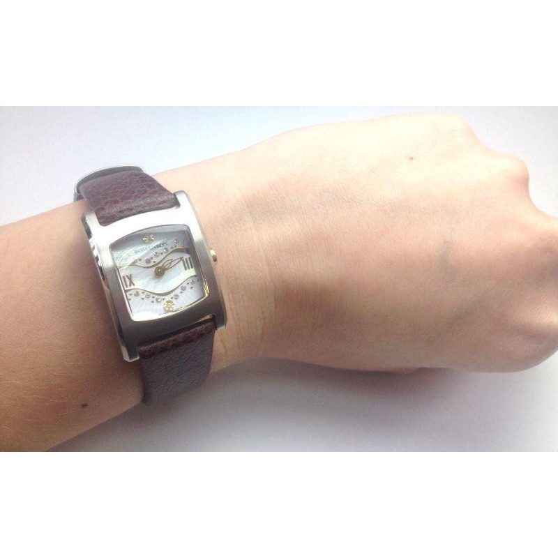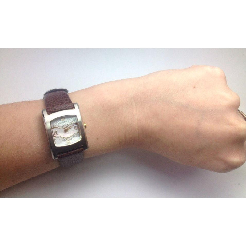 Корпус серебристого цвета. Кожаный ремешок тёмно-коричневого цвета. Декорированный циферблат перламу..