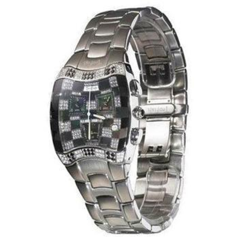 Корпус и браслет выполнены из стали серебристого цвета. Циферблат черного цвета, украшен фианитами. ..