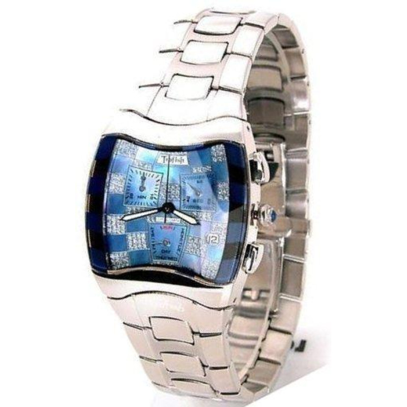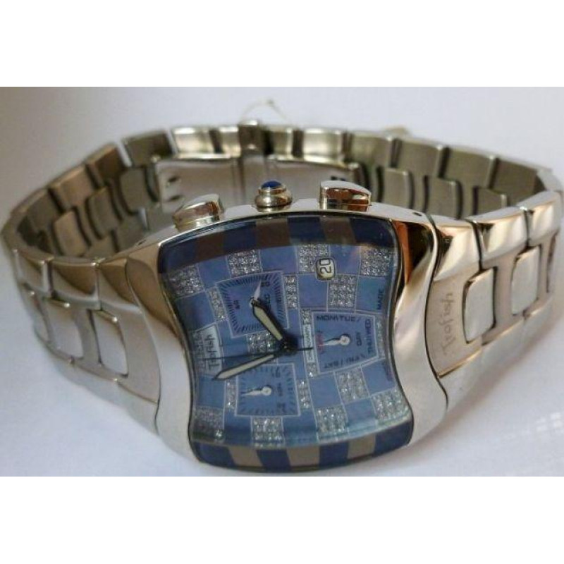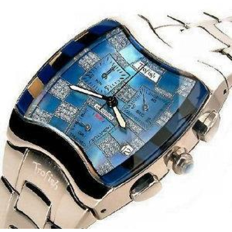 Корпус часов и браслет выполнены из стали. Цвет циферблата — голубой. Циферблат украшены фианитами. ..
