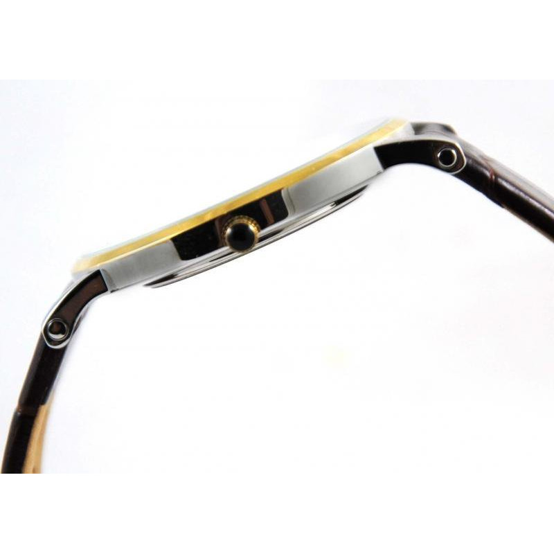 Корпус серебристого цвета с частичным PVD покрытием золотого цвета. Кожаный ремешок коричневого цвет..