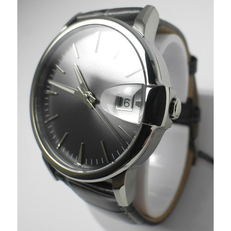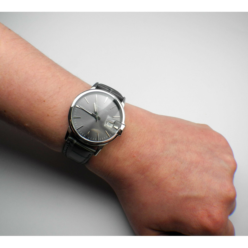 Циферблат - серый металлик. Ремешок из натуральной кожи, тёмно-серого цвета. Застёжка ремешка - пряж..