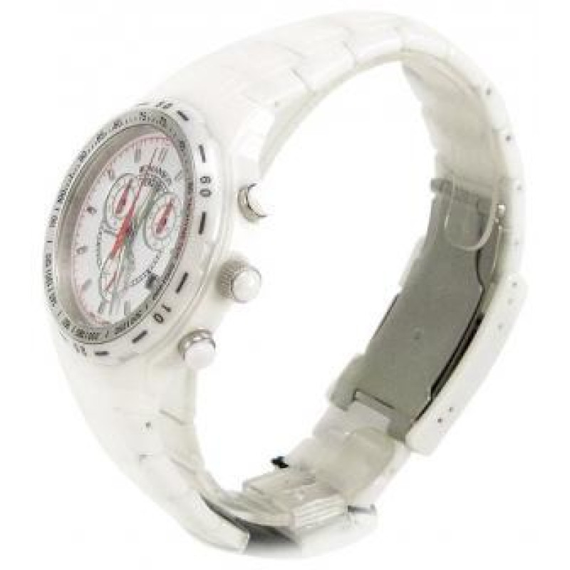 Модель имеет водонепроницаемость 30 м. Корпус выполнен из материала – комбинированный (сталь/керамика). Прочное сапфировое стекло надежно защищает циферблат от ударов и других повреждений. Удобный керамический браслет позволяет часам комфортно сидеть на запястье. Из дополнительных функций имеются: дата, день недели, секунды, тахиметр, хронограф.