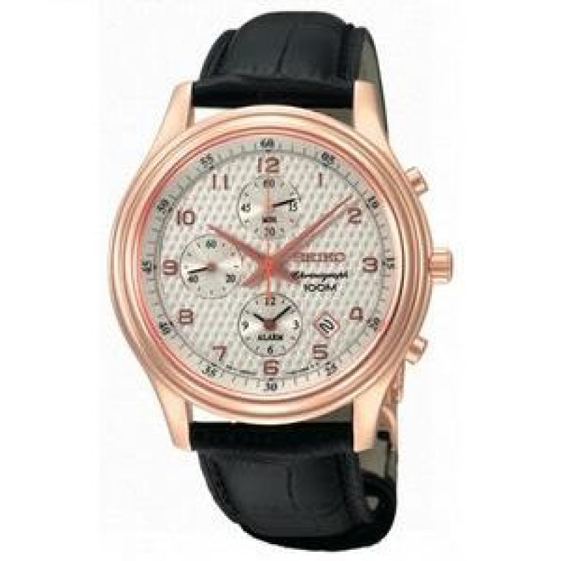 Корпус из нержавеющей стали срозовой позолотой, механизм 7T62, часы, минуты, секунды, индикация числ..