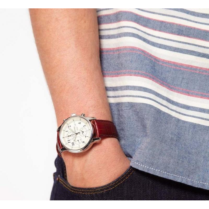 Модель имеет водонепроницаемость 100 м. Корпус выполнен из материала – сталь. Прочное минеральное стекло надежно защищает циферблат от ударов и других повреждений. Удобный кожаный ремешок позволяет часам комфортно сидеть на запястье. Из дополнительных функций имеются: дата, хронограф.