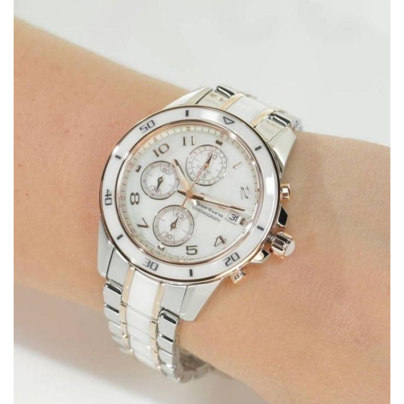 Модель имеет водонепроницаемость 100 м. Корпус выполнен из материала – комбинированный (сталь/керамика). Прочное сапфировое стекло надежно защищает циферблат от ударов и других повреждений. Удобный сталь + керамика браслет позволяет часам комфортно сидеть на запястье. Из дополнительных функций имеются: дата, секунды, хронограф.
