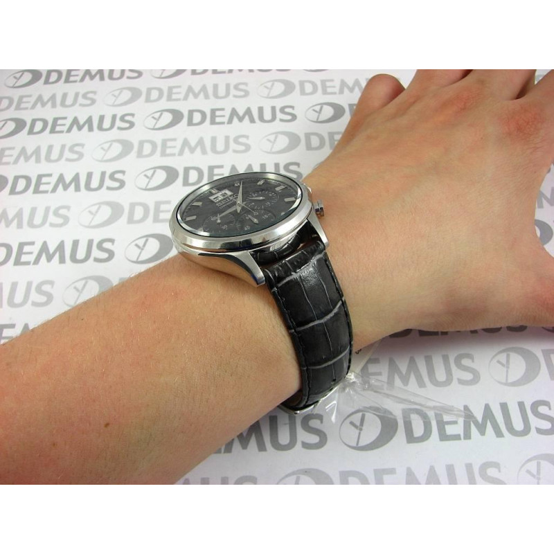 Модель имеет водонепроницаемость 100 м. Корпус выполнен из материала – сталь. Прочное минеральное стекло надежно защищает циферблат от ударов и других повреждений. Удобный кожаный ремешок позволяет часам комфортно сидеть на запястье. Из дополнительных функций имеются: дата, дополнительный показатель времени в 24-х часовом формате, минуты, секунды, хронограф, часы.