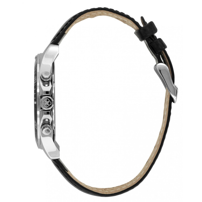 Модель имеет водонепроницаемость 100 м. Корпус выполнен из материала – сталь + PVD. Прочное сапфировое стекло надежно защищает циферблат от ударов и других повреждений. Удобный кожаный ремешок позволяет часам комфортно сидеть на запястье. Из дополнительных функций имеются: дата, дополнительный показатель времени в 24-х часовом формате, минуты, секунды, хронограф, часы.