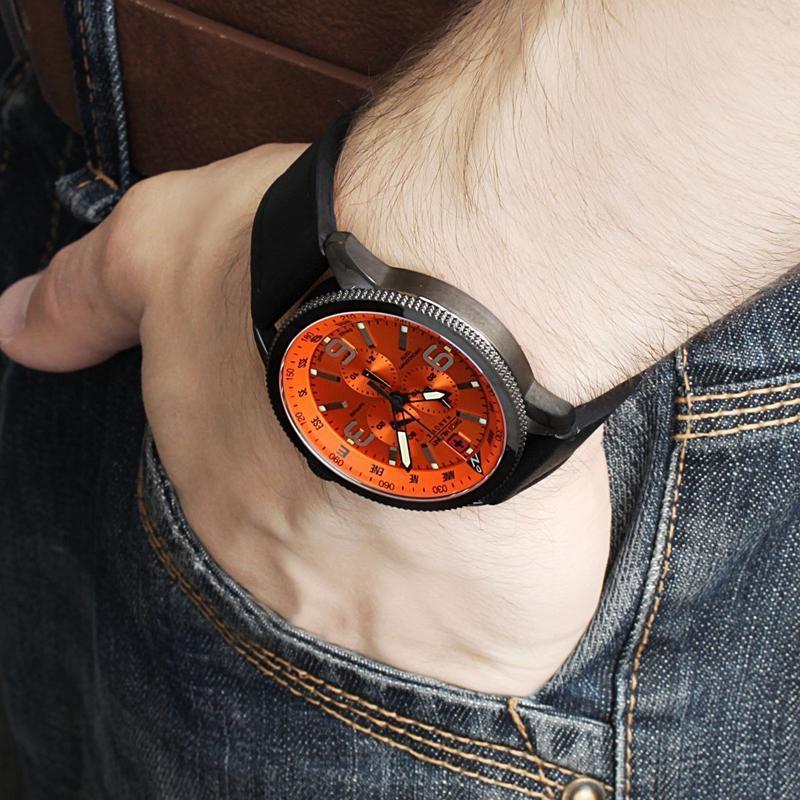 Модель имеет водонепроницаемость 100 м. Корпус выполнен из материала – сталь + PVD. Прочное сапфировое стекло надежно защищает циферблат от ударов и других повреждений. Удобный кожаный ремешок позволяет часам комфортно сидеть на запястье. Из дополнительных функций имеются: дата, секунды, хронограф.