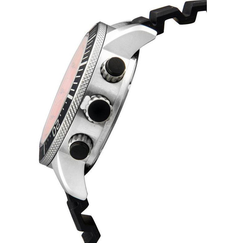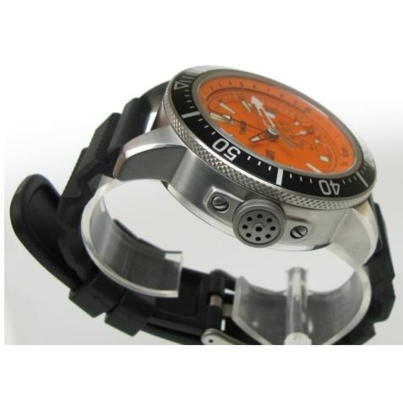 Модель имеет водонепроницаемость 200 м. Корпус выполнен из материала – сталь + PVD. Прочное минеральное стекло надежно защищает циферблат от ударов и других повреждений. Удобный каучук ремешок позволяет часам комфортно сидеть на запястье. Из дополнительных функций имеются: вращающийся безель, глубиномер, дата, индикатор зарядa элемента питания, минуты, секунды, термометр, часы, электролюминесцентная подсветка.