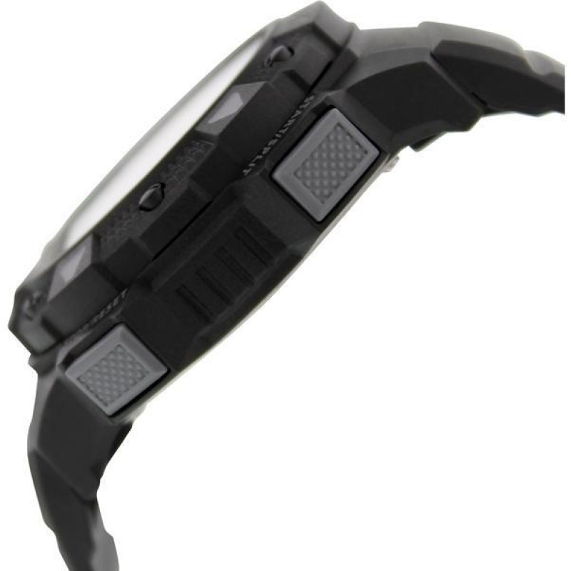 Модель имеет водонепроницаемость 100 м. Корпус выполнен из материала – пластик. Прочное пластиковое стекло надежно защищает циферблат от ударов и других повреждений. Удобный полимер ремешок позволяет часам комфортно сидеть на запястье. Из дополнительных функций имеются: 12 и 24-часовой формат времени, 3 будильника, GMT, автоматический календарь, противоударные, секундомер, секунды, таймер обратного отсчёта, электролюминесцентная подсветка.