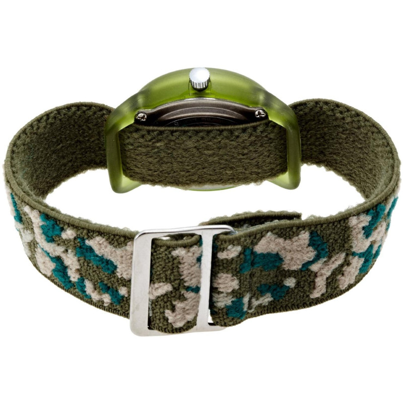 Модель имеет водонепроницаемость 30 м. Корпус выполнен из материала – пластик. Прочное пластиковое стекло надежно защищает циферблат от ударов и других повреждений. Удобный тканевый ремешок позволяет часам комфортно сидеть на запястье. Из дополнительных функций имеются: минуты, секунды, часы.