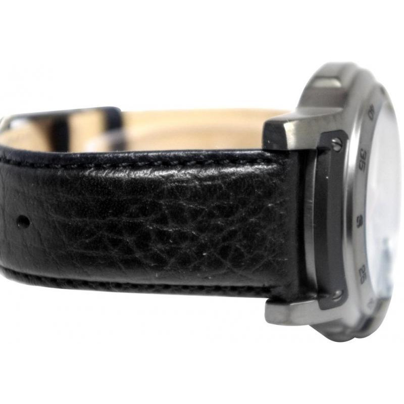 Модель имеет водонепроницаемость 50 м. Корпус выполнен из материала – сталь + PVD. Прочное минеральное стекло надежно защищает циферблат от ударов и других повреждений. Удобный кожаный ремешок позволяет часам комфортно сидеть на запястье. Из дополнительных функций имеются: дата, секунды.