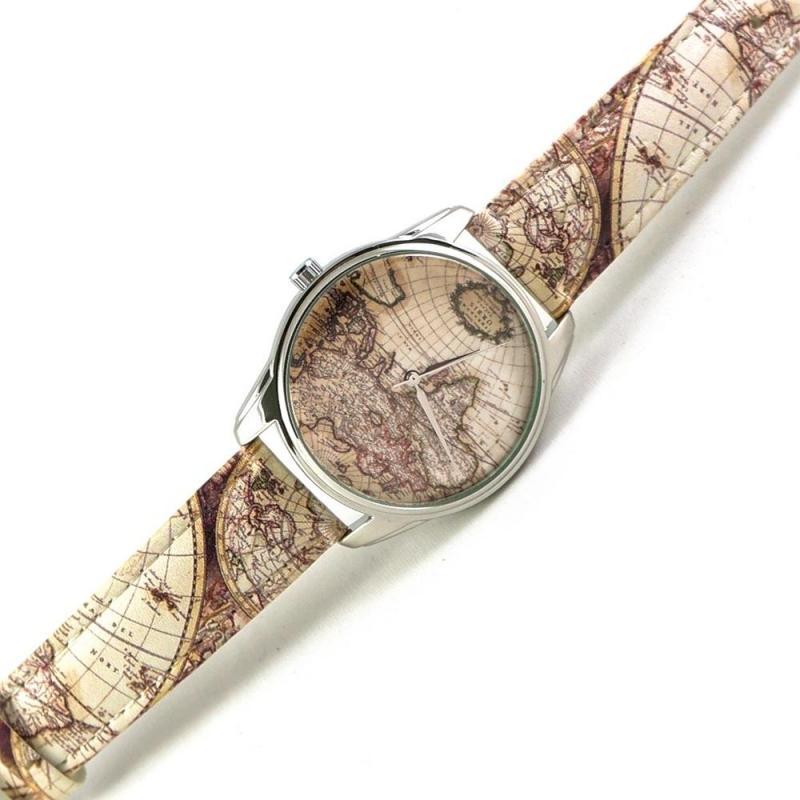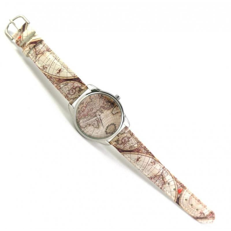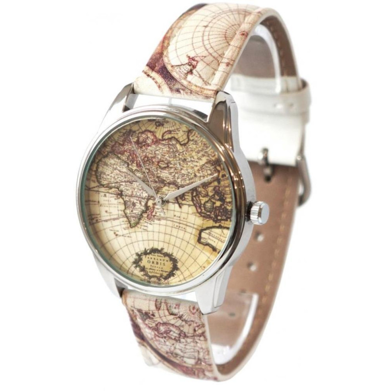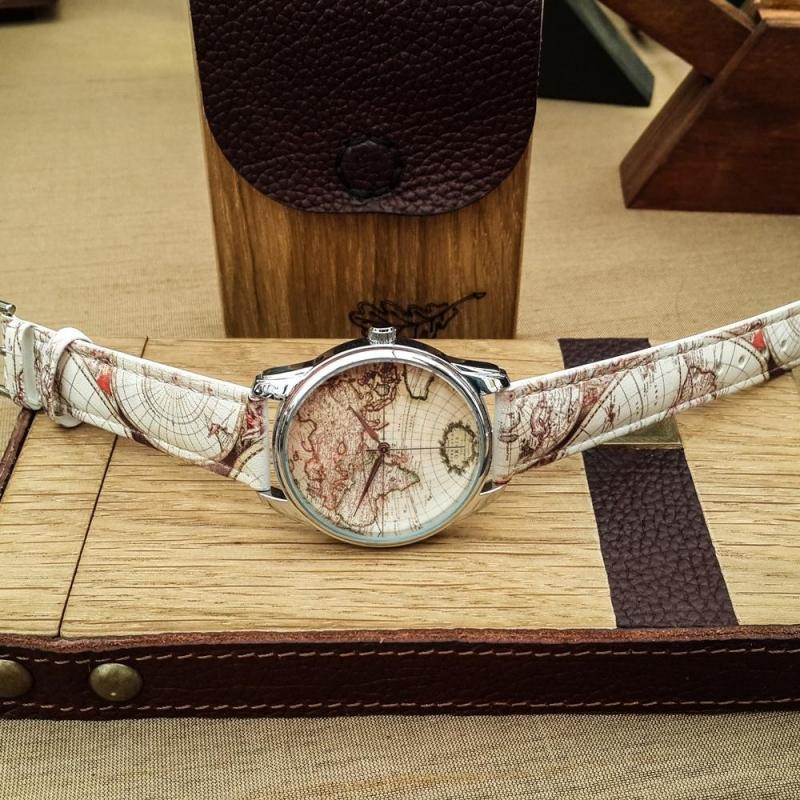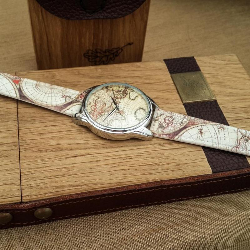 Часы ZIZ арт "Карта". На циферблате и ремешке часов нарисована карта мира. Ремешок часов изготовлен ..