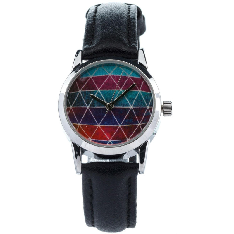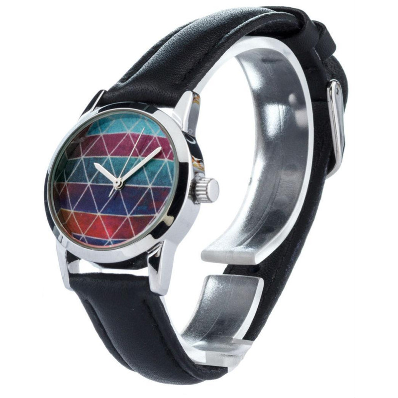 Данная модель получила название "Разноцветные треугольники". Ремешок выполнен из кожи, чёрного цвета..